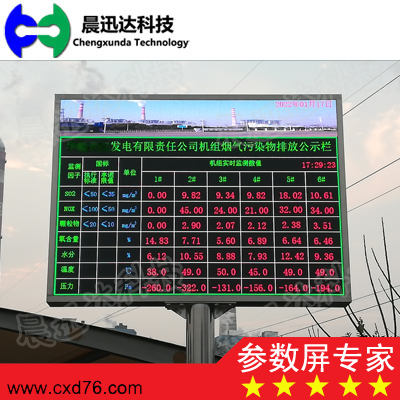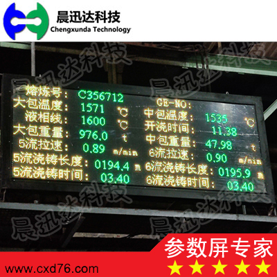 公司設計生產的工業參數顯示器(也稱:LED大屏、LED參數屏、工業參數屏、工業大屏、工業參數顯示屏、工業參數大屏幕,工業參數顯示板,工業參數看板,工業參數電子屏,上件參數看板、環保參數看板,環保信息顯示屏、連鑄大屏、連鑄LED屏、廢鋼參數屏、電力參數屏、中控參數屏、電力參數LED大屏)用于控制室、車間、監控室、戶外環保參數展示等場合,用于顯示電量、功率、頻率、溫度、濕度、壓力、液位、流量、轉速等各種工業參數的瞬時量、累計量。顯示采用大型數碼管、單雙色點陣LED屏、或全彩LED屏,以及各種尺寸工業LCD屏的方式,顯示方式靈活、清晰、醒目、直觀、性能穩定可靠、功耗低、壽命長。
